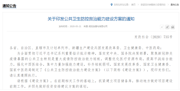 为贯彻落实秋冬季新冠肺炎疫情防控工作,加快补齐公共卫生防控救治短板弱项,全面提升重大疫情防控救治能力。国家发改委、国家卫健委、国家中医药管理局制定了《公共卫生防控救治能力建设方案》,并明确了“全面改善疾控机构设施设备条件”、“全面提升县级医院救治能力”、“健全完善城市传染病救治网络”、“改造升级重大疫情救治基地”等重要建设任务要求。