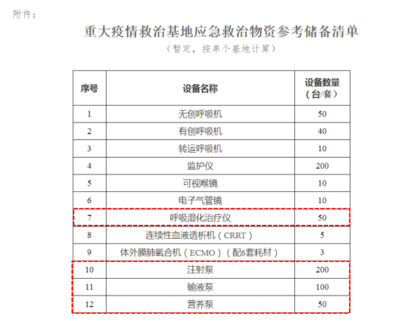 呼吸湿化治疗仪、注射泵、输液泵、营养泵都属应急救治物资。